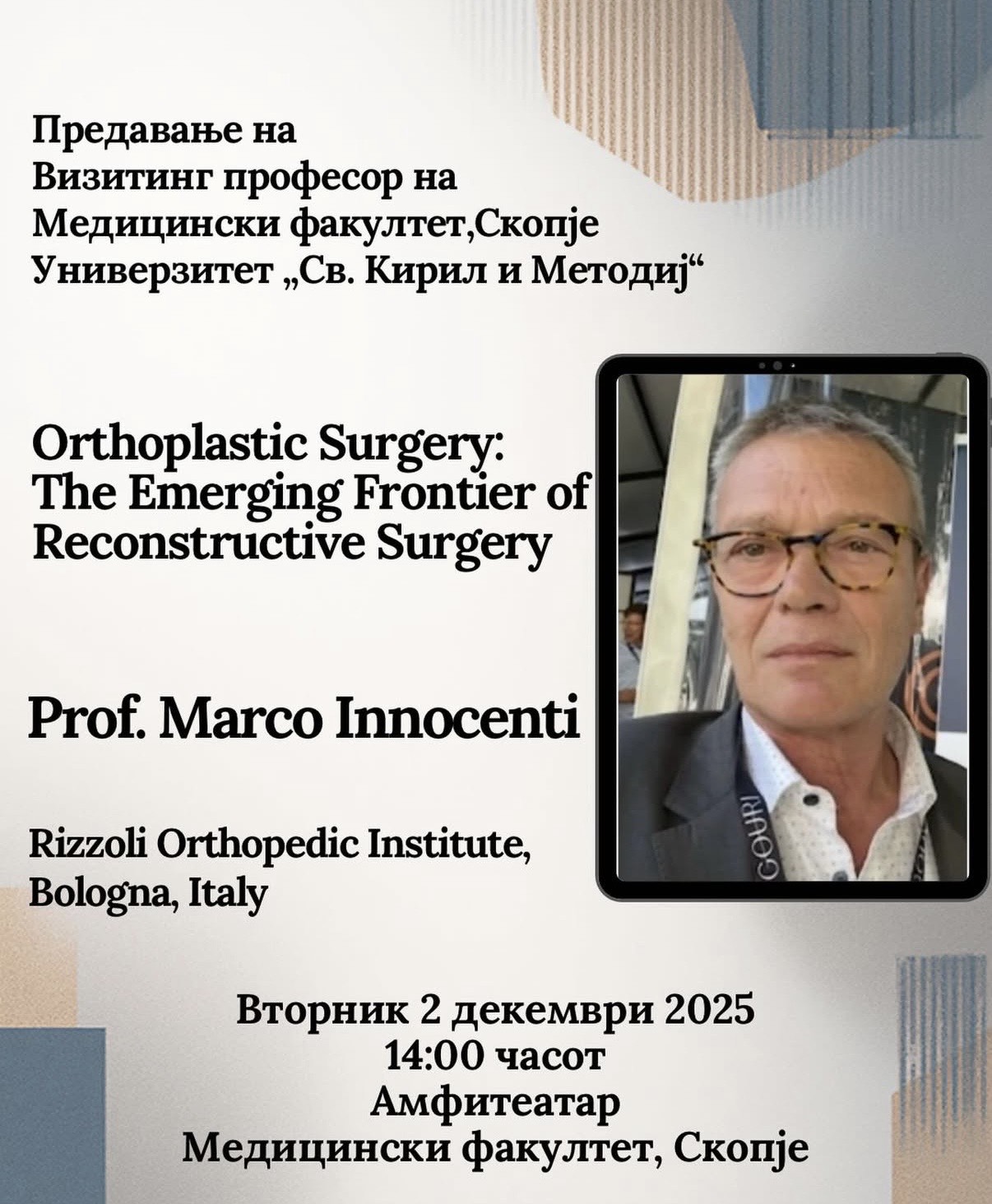 Со особена чест, Македонската асоцијација за реконструктивна микрохирургија (МАРМ) го најавува гостувањето на Marco Innocenti, светски признат експерт чиј клинички и академски опус има значајно и трајно влијание врз современата реконструктивна и ортопластична хирургија. Како визитинг-професор на Медицинскиот факултет при Универзитетот „Св. Кирил и Методиј“ – Скопје, проф. Innocenti носи знаење и искуство обликувани во водечките европски центри.